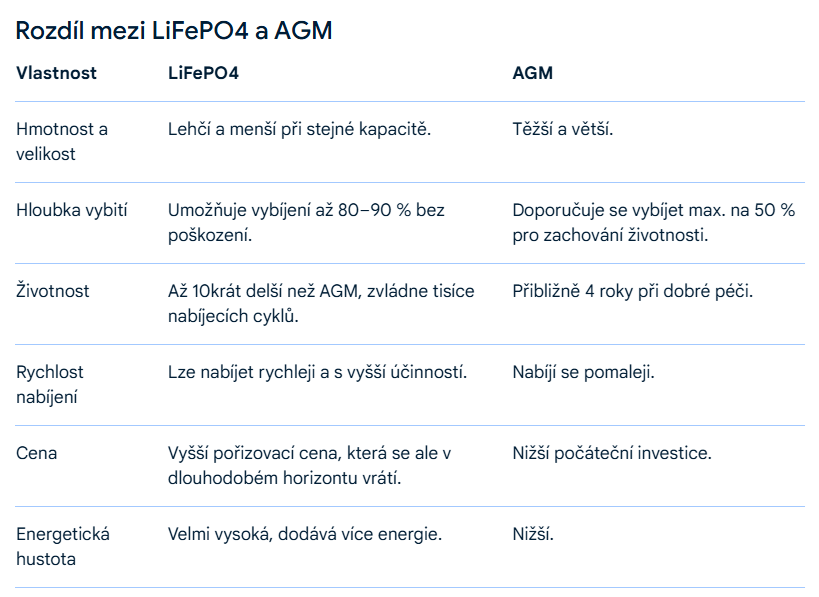 Do obytných aut se používají hlavně lithiové (LiFePO4) a olověné (AGM, gelové) baterie, přičemž LiFePO4 baterie jsou výrazně lehčí, menší a mají delší životnost, ale také vyšší pořizovací cenu. Rozdíl mezi AGM a LiFePO4 spočívá především v Hloubce vybití (AGM max 50%, LiFePO4 až 90%), rychlosti nabíjení, životnosti a hmotnosti, kdy lithiové baterie nabízejí mnohem vyšší výkon a delší životnost.
