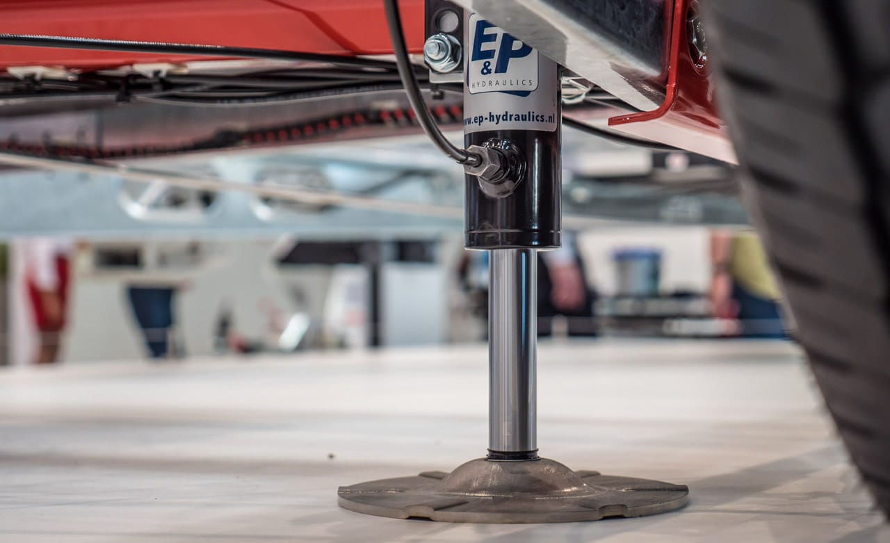 Vrcholný produkt: hydraulický podpěrný systém. Na rozdíl od obytných vozů je tato technologie u karavanů stále relativně nová. Hydraulické podpěry se skládají ze dvou hlavních podpěr na nápravě a čtyř podpěr v rozích, které se ovládají pomocí ovládacího panelu, bezdrátové dotykové obrazovky nebo chytrého telefonu.