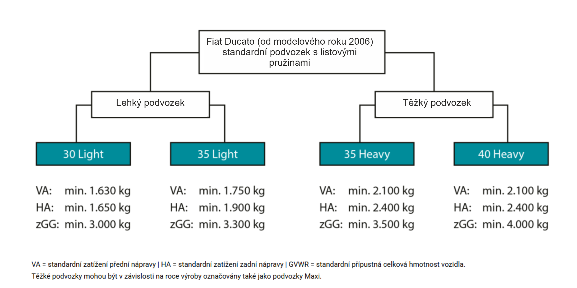 U mnoha modelů (LIGHT I HEAVY CHASSIS) lze užitečnou hmotnost zvýšit pomocí zesíleného či dodatečného odpružení a vhodné kombinace kol a pneumatik.